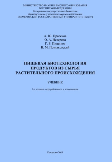 Пищевая биотехнология продуктов из сырья растительного происхождения : учебник / А. Ю. Просеков, О. А. Неверова, Г. Б. Пищиков, В. М. Позняковский. – 2-е изд., доп. и перераб. – Кемерово : КемГУ, 2019. – 262 с. – ISBN 978-5-8353-2544-3.