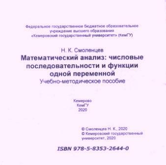 Смоленцев, Н. К. Математический анализ: числовые последовательности и функции одной переменной : учебное пособие / Н. К. Смоленцев. – Кемерово : КемГУ, 2020. – 169 с. – ISBN 978-5-8353-2644-0.