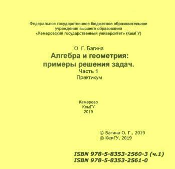 Багина, О. Г. Алгебра и геометрия: примеры решения задач. Ч. 1 : практикум / О. Г. Багина. – Кемерово : КемГУ, 2019. – 112 с. – ISBN 978-5-8353-2560-3.