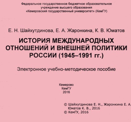 Шайхутдинова, Е. Н. История международных отношений и внешней политики России (1945-1991 гг.) : электронное учебно-методическое пособие / Е. Н. Шайхутдинова, Е. А. Жаронкина, К. В. Юматов. – Кемерово : КемГУ, 2016. – CD-ROM.
