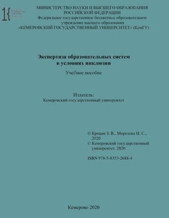 Экспертиза образовательных систем в условиях инклюзии : учебное пособие / составители З. В. Крецан, И. С. Морозова. – Кемерово : КемГУ, 2020. – 175 с. – ISBN 978-5-8383-2688-4.