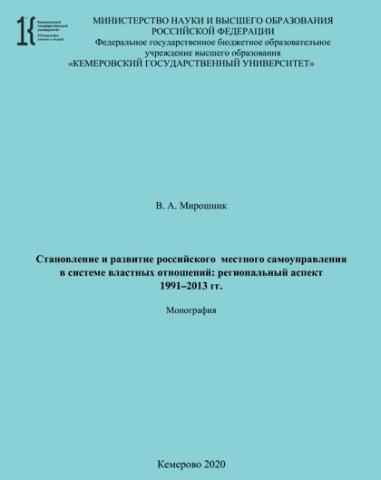 Мирошник, В. А. Становление и развитие российского местного самоуправления в системе властных отношений: региональный аспект. 1991–2013 гг. : монография / В. А. Мирошник. – Кемерово : КемГУ, 2020. – 220 с. – ISBN 978-5-8353-2652-5.