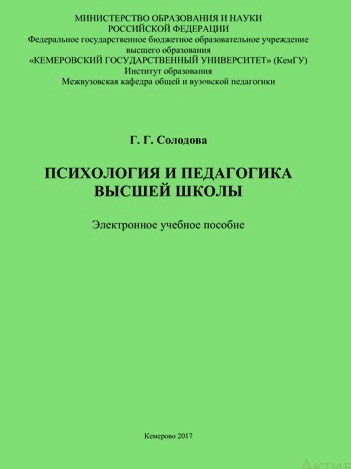 Солодова, Г. Г. Психология и педагогика высшей школы : учебное пособие / Г. Г. Солодова. – Кемерово : КемГУ, 2017. – 55 с. – ISBN 978-5-8353-2156-8.