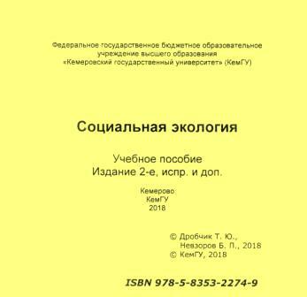 Дробчик, Т. Ю. Социальная экология : практикум / Т. Ю. Дробчик, Б. П. Невзоров. – Кемерово : КемГУ, 2019. – 164 с. – (Высшее образование). – ISBN 978-5-8353-2274-9.