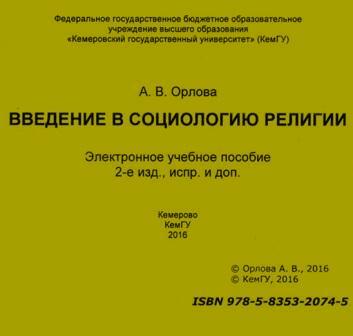 Орлова, А. В. Введение в социологию религии : электронное учебное пособие / А. В. Орлова. – 2-е изд., испр. и доп. – Кемерово : КемГУ, 2016. – CD-ROM. – ISBN 978-5-8353-2074-5.