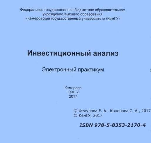 Инвестиционный анализ : электронный практикум / составители Е. А. Федулова, С. А. Кононова. – Кемерово : КемГУ, 2017. – 111 с. – ISBN 978-5-8353-2170-4.
