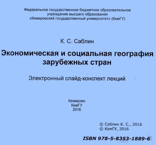 Саблин, К. С. Экономическая и социальная география зарубежных стран : электронный слайд-конспект лекций / К. С. Саблин. – Кемерово : КемГУ, 2016. – CD-ROM. – ISBN 978-5-8353-1889-6.
