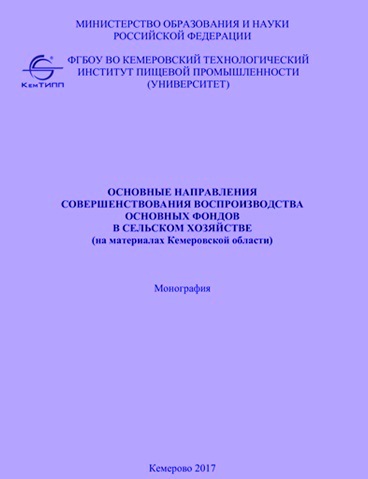 Основные направления совершенствования воспроизводства основных фондов в сельском хозяйстве (на материалах Кемеровской области) : монография / В. П. Зотов, Р. М. Котов, О. А. Коньшина [и др.] . – Кемерово : КемГУ, 2017. – 158 с. – ISBN 979-5-89289-157-7.
