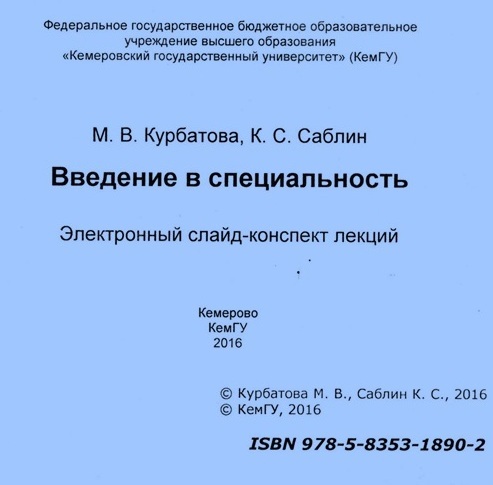 Курбатова, М. В. Введение в специальность : электронный слайд-конспект лекций / М. В. Курбатова, К. С. Саблин. – Кемерово : КемГУ, 2016. – CD-ROM. – ISBN 978-5-8353-1890-2.