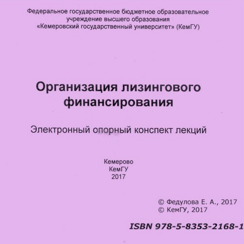 Федулова, Е. А. Организация лизингового финансирования: электронный опорный конспект лекций / Е. А. Федулова. – Кемерово : КемГУ, 2017. – CD-ROM. – ISBN 978-5-8353-2168-1.