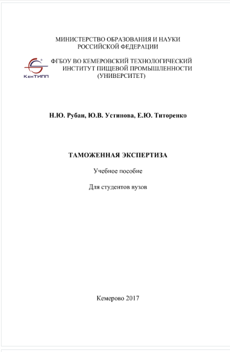 Рубан, Н. Ю. Таможенная экспертиза : учебное пособие для вузов / Н. Ю. Рубан, Ю. В. Устинова, Е. Ю. Титоренко. – Кемерово : КемГУ, 2017. – 100 с. – ISBN 979-5-89289-116-4.