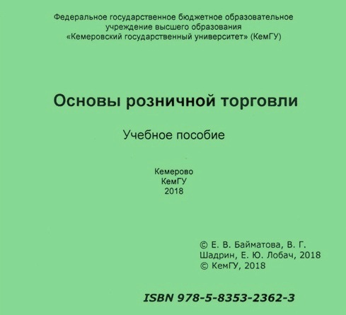 Основы розничной торговли : учебное пособие / составители Е. В. Байматова, В. Г. Шадрин, Е. Ю. Лобач. – Кемерово : КемГУ, 2018. – 97 с. – ISBN 978-5-8353-2362-3.