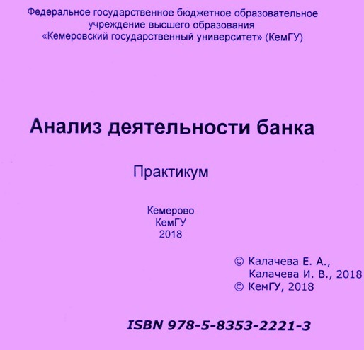 Анализ деятельности банка: практикум : учебное пособие / составители Е. А. Калачева, И. В. Калачева. – Кемерово : КемГУ, 2018. – 92 с. – ISBN 978-5-8353-2221-3.